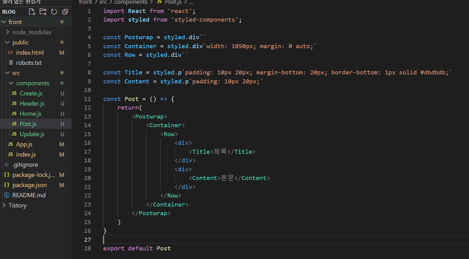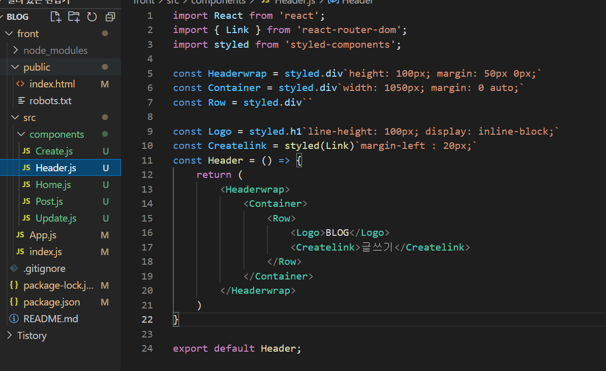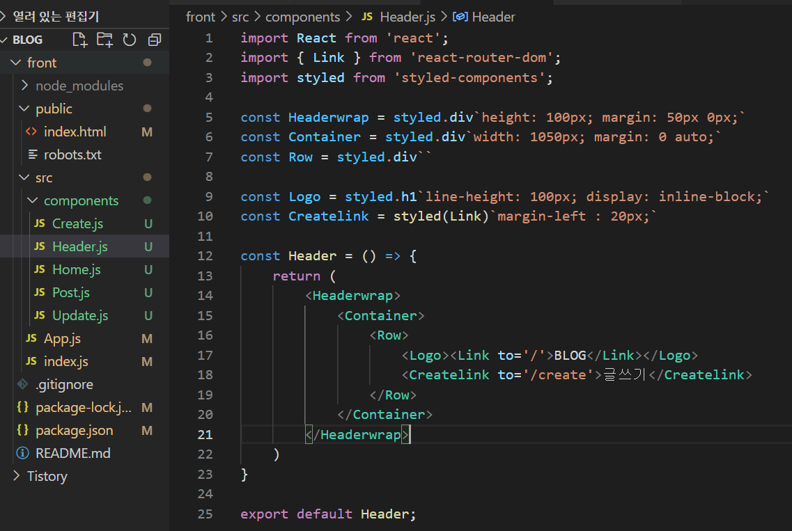 create.js 코드를 작성하고 header.js 에서 로고와 글쓰기링크에도 링크를 걸었다.