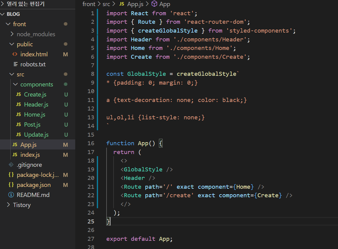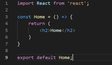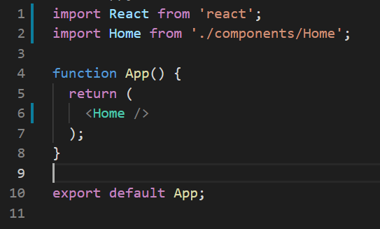 Home.js 파일을 작성하고 App.js 에서 임포트 해서 사용해 보자.