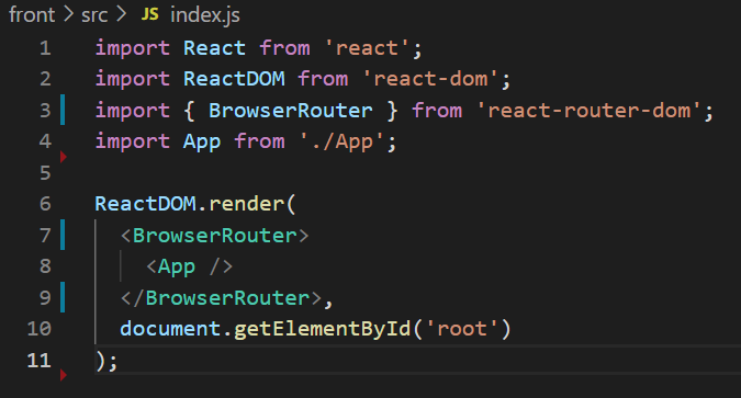 라우터 적용을 위해 index.js 에서 BrowserRouter 라는 컴포넌트를 사용한다.