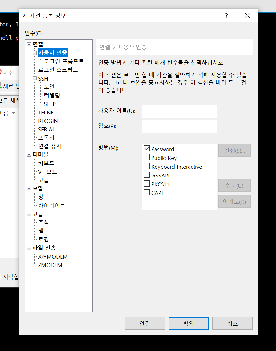 원격접속을 하기 위해 XSHELL 을 사용했습니다.